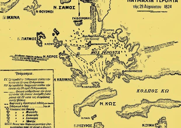 Αύγουστος 1824: Ο Μιαούλης τσακίζει τον Τουρκικό στόλο δίπλα στα Ίμια στη Ναυμαχία του Γέροντα και σώζει την επανάσταση του 1821.