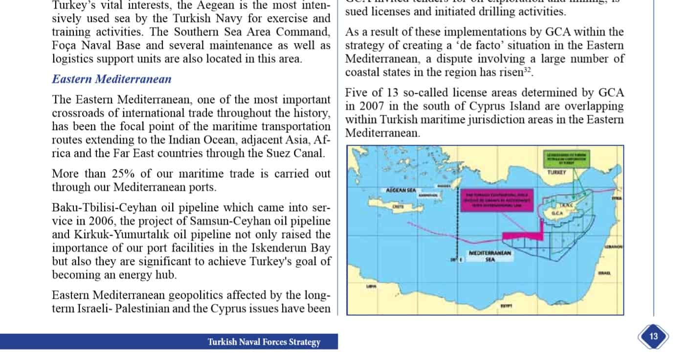 Όμως, η Τουρκία ήδη από τις 12 Μαρτίου 2013 με τη ρηματική διακοίνωσή της στον ΟΗΕ δήλωνε μονομερώς τα όρια της υφαλοκρηπίδας της στην Ανατολική Μεσόγειο, που βεβαίως ταιριάζουν απολύτως με τις περιγραφές της «Γαλάζιας Πατρίδας» από τον Τ. Ερντογάν και τον Χ. Ακάρ.