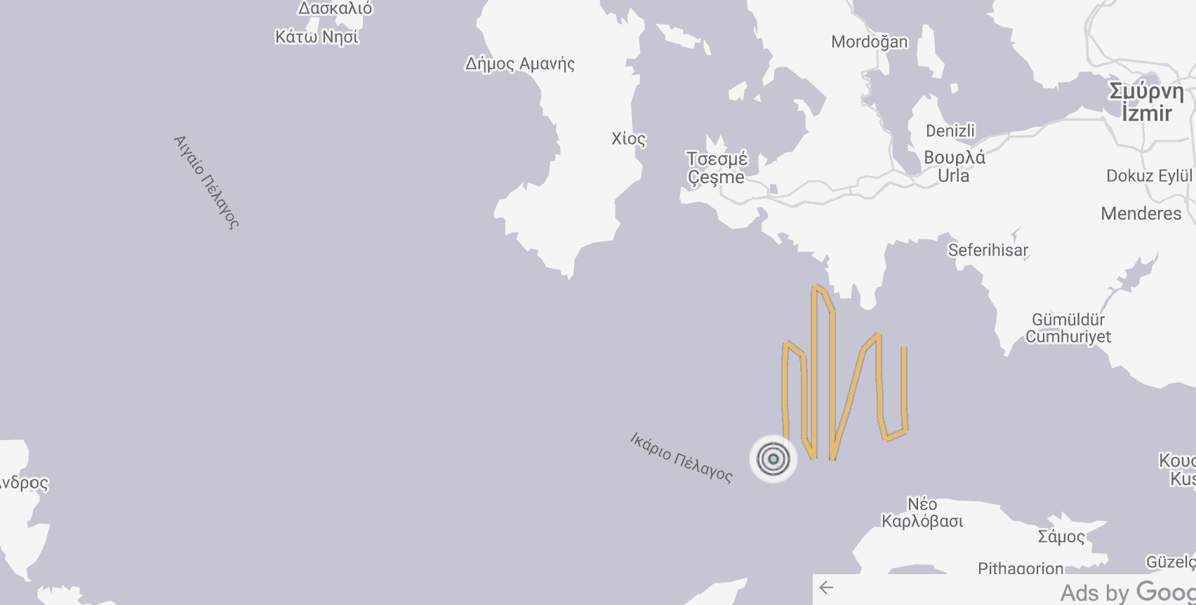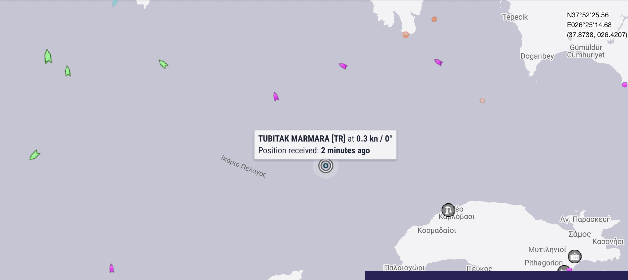 Το ερευνητικό σκάφος Tubitak Maramara, όλο και “ανοίγεται” στο Αιγαίο και σήμερα “αρμενίζει” στο Ικάριο πέλαγος, όπως φαίνεται από το marinetraffic.