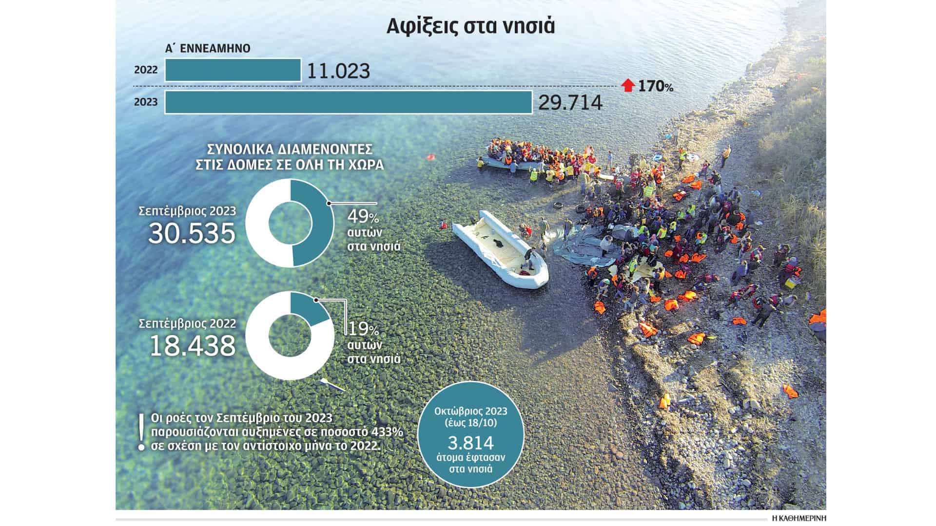 Στα Κέντρα Υποδοχής και Ταυτοποίησης (ΚΥΤ) των νησιών βρίσκονται 16.172 άτομα, εκ των οποίων, σύμφωνα με πληροφορίες, περίπου 3.000 φέρονται να είναι Παλαιστίνιοι. Παρά τις μεταφορές που πραγματοποιούνται στην ενδοχώρα, ο πληθυσμός των διαμενόντων στα ΚΥΤ των νησιών έχει διπλασιαστεί μέσα σε ενάμιση μήνα.
