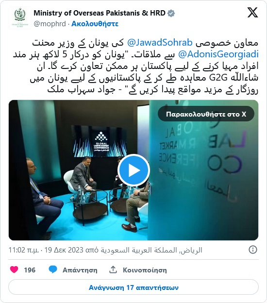 «Εστιάζουμε στην κάλυψη της ανάγκης της Ελλάδας για 500.000 ειδικευμένους εργάτες, ιδιαίτερα στις κατασκευές. Τις επόμενες ημέρες θα υπογράψουμε μια συμφωνία G2G με την Ελλάδα, η οποία θα ξεκλειδώσει τεράστιες ευκαιρίες εργασίας στην Ελλάδα για τους Πακιστανούς μας».