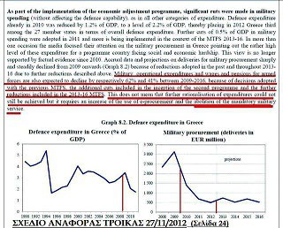 Συγκεκριμένα αναφέρουν: «Οι μειώσεις στους στρατιωτικούς εξοπλισμούς την περίοδο 2013-2014 ανέρχονται σε περίπου 340 εκατ. ευρώ και έρχονται να προστεθούν στις παλαιότερες μειώσεις στρατιωτικών προμηθειών. Άλλα μέτρα συμπεριλαμβάνουν μείωση σε επιχειρησιακές δαπάνες μέσω κλεισίματος στρατοπέδων και μείωση του αριθμού των εισαχθέντων σε στρατιωτικές σχολές. Τη διετία 2013-2014. αναμένεται να εξοικονομηθούν συνολικά περίπου 400 εκατ. ευρώ, ποσό που ανέρχεται στο 0,2% του ΑΕΠ της Ελλάδας».