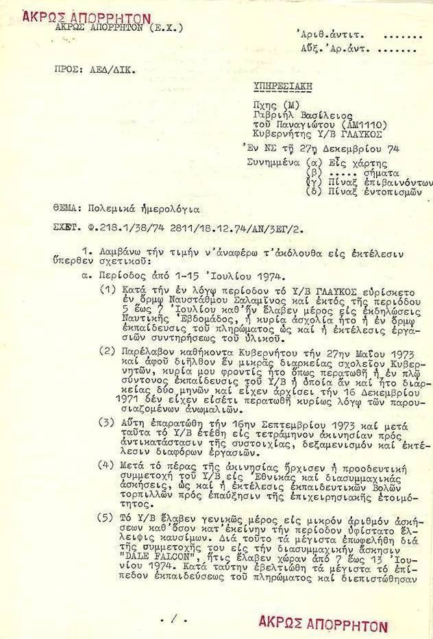 Η πρώτη σελίδα της απόρρητης έκθεσης του Πλωτάρχη Βασίλειου Γαβριήλ, Κυβερνήτη του Υ/Β ΓΛΑΥΚΟΣ (S110), σύμφωνα με την οποία το υποβρύχιο είχε συμμετάσχει στην ΝΑΤΟική άσκηση DALE FALCON από 7 έως 13 Ιουνίου 1974, κατά την οποία «εβελτιώθη τα μέγιστα το επίπεδον εκπαιδεύσεως του πληρώματος».