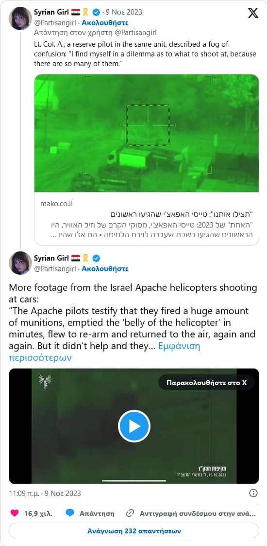 Σύμφωνα με το ισραηλινό δημοσίευμα 8 ελικόπτερα Apache απογειώθηκαν μόλις έγινε γνωστή η επίθεση της Χαμάς. Μέσα στο χάος που επικρατούσε οι ισραηλινοί πιλότοι έριχναν αδιακρίτως σε ότι έβλεπαν να κινείται! Οχήματα και ανθρώπους!