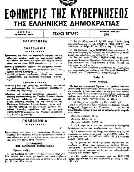 ΠΔ 270/ 1985 Τροποποίηση όρων και περιορισμών δόμησης γηπέδων κειμένων εκτός των ρυμοτομικών σχεδίων των πόλεων και εκτός των νομίμων υφισταμένων προ του έτους 1923 οικισμών.
