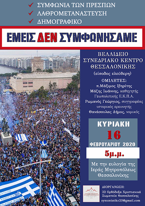 Τά Ὀρθόδοξα Χριστιανικά Σωματεῖα τῆς Θεσσαλονίκης, ἀπό τήν καρδιά τῆς Μίας καί ἑλληνικῆς ΜΑΚΕΔΟΝΙΑΣ, μέ τήν εὐλογία τοῦ Παναγιωτάτου Μητροπολίτου Θεσσαλονίκης κ. Ἀνθίμου, διοργανώνουν ἐκδήλωση διαμαρτυρίας τήν Κυριακή 16 Φεβρουαρίου στίς 5 μ.μ. στό Βελλίδειο Συνεδριακό Κέντρο Θεσσαλονίκης, μέ θέμα τίς ἀνησυχητικές ἐξελίξεις πού λαμβάνουν χώρα στήν πατρίδα μας ἐρήμην τῆς βούλησης τοῦ κυριάρχου ἑλληνικοῦ λαοῦ.