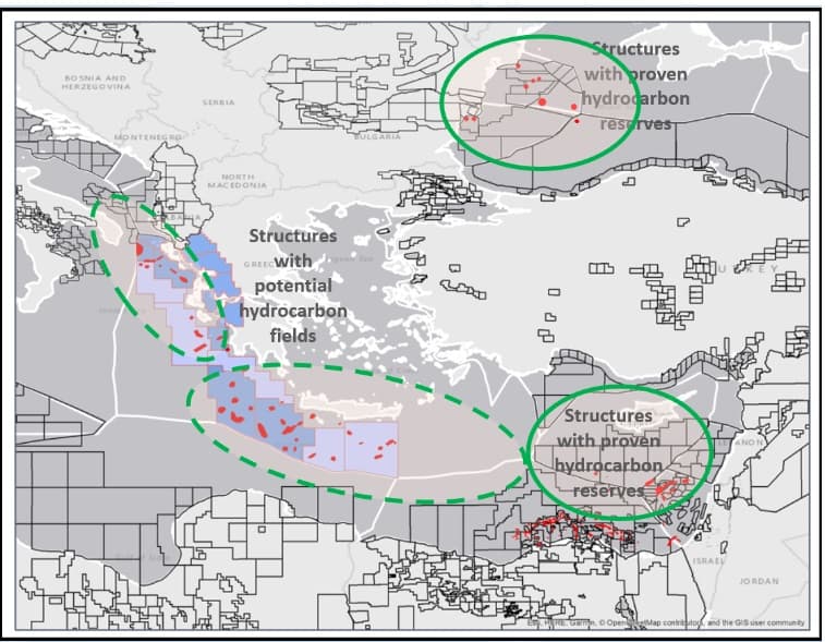 Οι εκτιμώμενοι πόροι φυσικού αερίου από 30 ελληνικές περιοχές δυτικά, νοτιοδυτικά και νότια της Κρήτης, καθώς και από το Ιόνιο, αντιπροσωπεύουν δυνητικά κοιτάσματα 70-90 τρισ. κυβικά πόδια, δηλαδή 12-15 δισ. βαρέλια ισοδύναμου πετρελαίου. Αυτά θα μπορούσαν να αυξήσουν τα αποθέματα φυσικού αερίου στην Ανατολική Μεσόγειο, ωθώντας το κέντρο βάρος των πηγών φυσικού αερίου δυτικότερα. Έτσι η Ελλάδα μπορεί να καταστεί παραγωγός κι όχι μόνο διακομιστής.