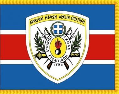 Το έμβλημα της Σχολής είναι μια σύνθετη απεικόνιση, δύο τυφεκίων, δύο ξιφών, σωλήνα πυροβόλου και οβίδας, που συμβολίζουν τα ιστορικά όπλα του Ελληνικού Στρατού (Πεζικό, Τεθωρακισμένα και Πυροβολικό). Η σύνθεση αυτή, πλαισιώνεται με το έτος ιδρύσεως της Σχολής (1828), με δύο κλάδους δάφνης και το έμβλημα της Ελληνικής Δημοκρατίας. Επίγραμμα του εμβλήματος, είναι η φράση του σοφού της αρχαίας Αθήνας Σόλωνα, "ΑΡΧΕΣΘΑΙ ΜΑΘΩΝ ΑΡΧΕΙΝ ΕΠΙΣΤΗΣΕΙ", το οποίο υποδηλώνει το βασικό σκοπό της παιδευτικής αγωγής των Ευελπίδων και τους υπενθυμίζει την αξία της πειθαρχίας