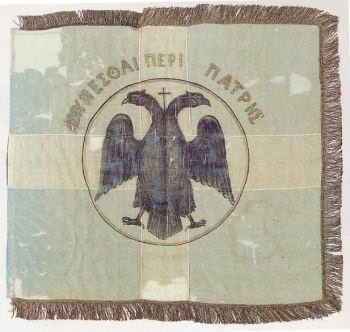 Σημαία του Μακεδονικό Αγώνα. Κυανόλευκη, φέρει δικέφαλο αετό και την επιγραφή ΑΜΥΝΕΣΘΑΙ ΠΕΡΙ ΠΑΤΡΗΣ.