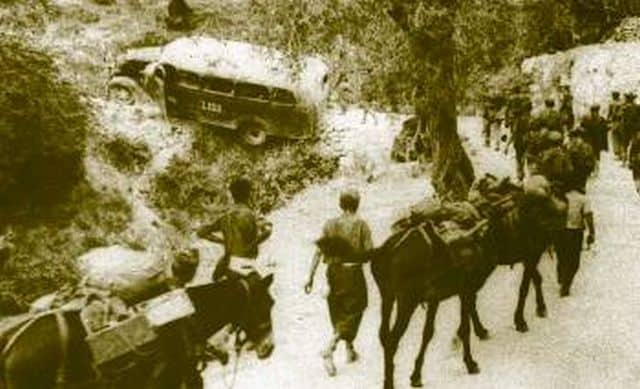 Ιταλοί ημιονηγοί μεταφέρουν με τα μουλάρια τους πυρομαχικά. Στο βάθος κατεστραμμένο λεωφορείο