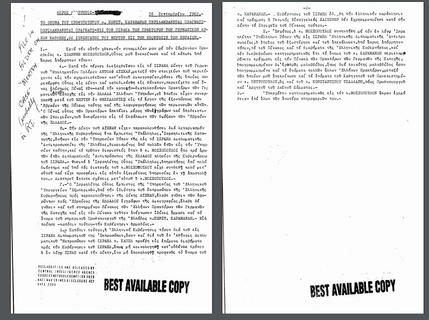 Απόρρητο έγγραφο που βρίσκεται στον ιστότοπο της CIA (http://bit.ly/2ftOkm6, ανήκει στη συλλογή εγγράφων για τα εγκλήματα πολέμου των Ναζί και αποχαρακτηρίστηκε το 2006) αναφέρει πως ο Kων/νος Καραμανλής συνεργαζόταν με τις γερμανικές αρχές κατοχής, ενώ τον συνδέει και με την εξόντωση των Εβραίων της Θεσσαλονίκης.