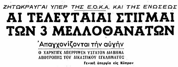 Εκείνες τις συγκλονιστικές στιγμές του απαγχονισμού, ο Ευαγόρας Παλληκαρίδης, χωρίς να γνωρίζει το δικό του τέλος, έγραψε ένα ποίημα για τους τρεις. Απαγχονίστηκε έξι μήνες μετά. Και ήταν μόλις 19 ετών.