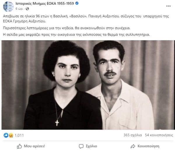 Έφυγε από τη ζωή σε ηλικία 96 ετών η Βασιλική, «Βασιλού», Παναγή Αυξεντίου, σύζυγος του θρυλικού Ήρωα και υπαρχηγού της ΕΟΚΑ, Γρηγόρη Αυξεντίου.
