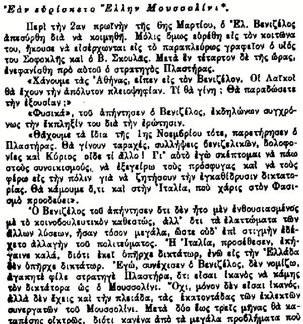 Η συνοπτική ιστορική αναδρομή που ακολουθεί, επιχειρεί να παρουσιάσει παρασιωπούμενα στοιχεία προερχόμενα από τους ίδιους τους πρωταγωνιστές και από αδιαμφισβήτητες πηγές, προσκείμενες προς τον Ε. Βενιζέλο και Ν. Πλαστήρα, από τα οποία προκύπτει ότι και οι δύο αυτοί άνδρες ήταν θιασώτες του φασιστικού καθεστώτος του Μουσολίνι, το οποίο προσπάθησαν ανεπιτυχώς λίγο πριν από το 1936 να εγκαθιδρύσουν δια των όπλων πραξικοπηματικά στη Ελλάδα.