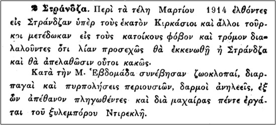 Στις 6 Απριλίου 1914, διακόσιες ελληνικές οικογένειες από τη Στράντζα (τουρκικά: Binkilic) απελάθηκαν. Αφού ξυλοκοπήθηκαν και τους αφαιρέθηκαν τα είδη αξίας, αφού τους υπεξαιρέθηκαν εκβιαστικά τεράστια ποσά, Τούρκοι στρατιωτικοί και χωροφύλακες, με τα ξίφη υψωμένα, τους εξανάγκασαν να φύγουν.