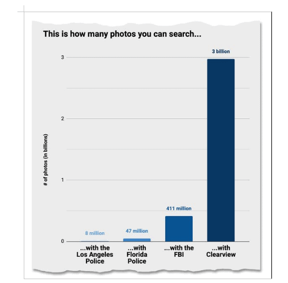 Μια πάλαι ποτέ μικρή start-up από τη Νέα Υόρκη, δημιούργημα του 31χρονου Αυστραλού με καταγωγή από το Βιετνάμ Hoan Ton-That, έχει συλλέξει από δημόσια προσβάσιμες πηγές του διαδικτύου 3 δισεκατομμύρια φωτογραφίες πολιτών και τις πουλάει σε αστυνομικές αρχές με την εφαρμογή αναγνώρισης προσώπου που έχει αναπτύξει.