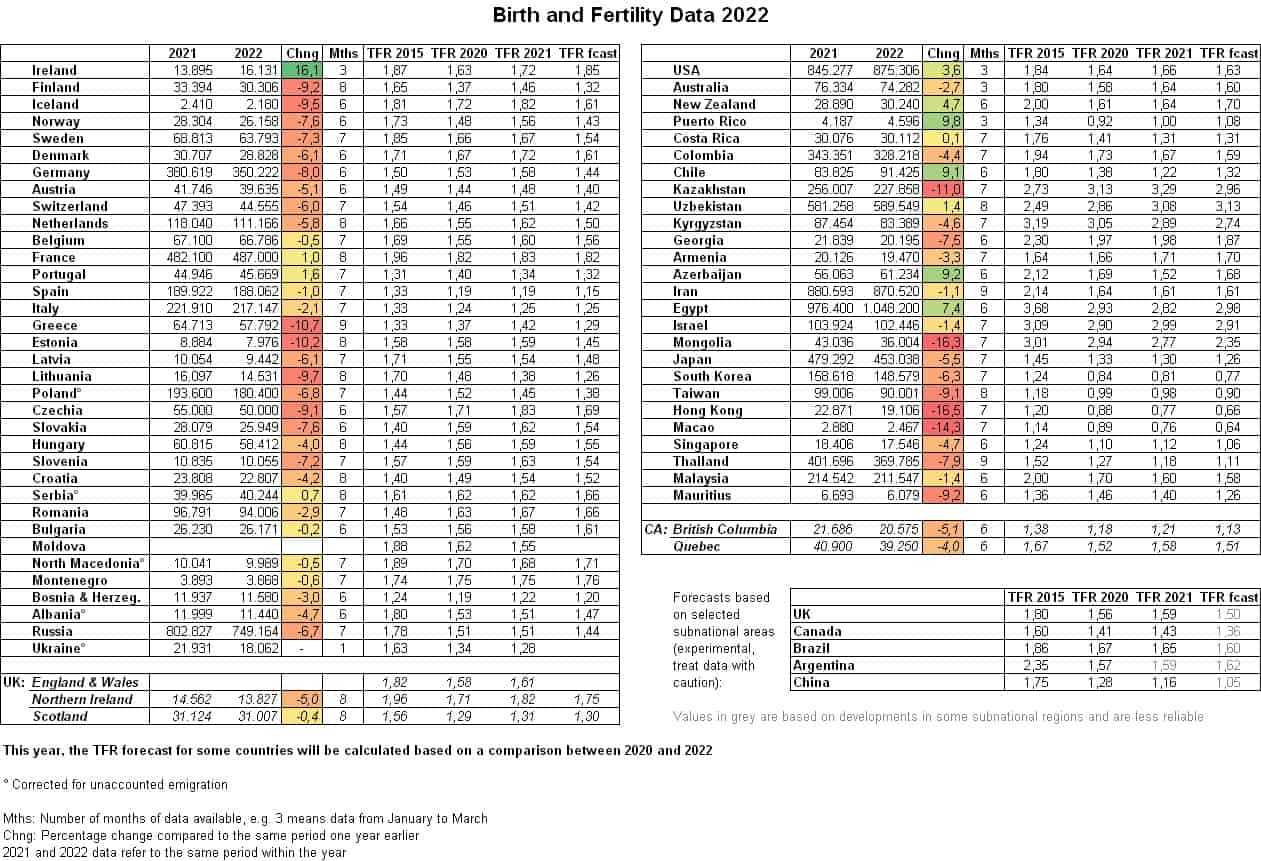 Ο Δείκτης Ολικής Γονιμότητας (TFR) που δείχνει το μέσο όρο των παιδιών που θα γεννηθούν από μια γυναίκα κατά τη διάρκεια της ζωής της, αντιστοιχεί σε 1,29 παιδιά ανά γυναίκα. Ο Δείκτης Ολικής Γονιμότητας για το 2022 (TFR fcast) στην Ελλάδα προβλέπεται να είναι ο 4ος μικρότερος στην Ευρώπη. Επίσης, όλο παραδόξως αυτός ο δείκτης παρουσιάζει τις μικρότερες τιμές στις χώρες με τα υψηλότερα ποσοστά εμβολιασμού με γενετικά σκευάσματα κατά της νόσου Covid, όπως η Πορτογαλία, η Ισπανία, η Ιταλία, η Σιγκαπούρη, Η Νότια Κορέα κτλ. Αντιθέτως, χώρες με χαμηλά ποσοστά εμβολιασμού όπως η Βουλγαρία, η Ρουμανία και οι περισσότερες χώρες της πρώην Γιουγκοσλαβίας προβλέπεται να έχουν καλύτερο Δείκτη Ολικής Γονιμότητας ακόμα και από πλουσιότερες χώρες της βόρεια Ευρώπης. Θα περιμένουμε μέχρι το τέλος του έτους για να έχουμε τα πιο Ακριβή συμπεράσματά, αλλά οι πρώτοι 9 μήνες του 2022 δείχνουν τη μεγάλη εικόνα.