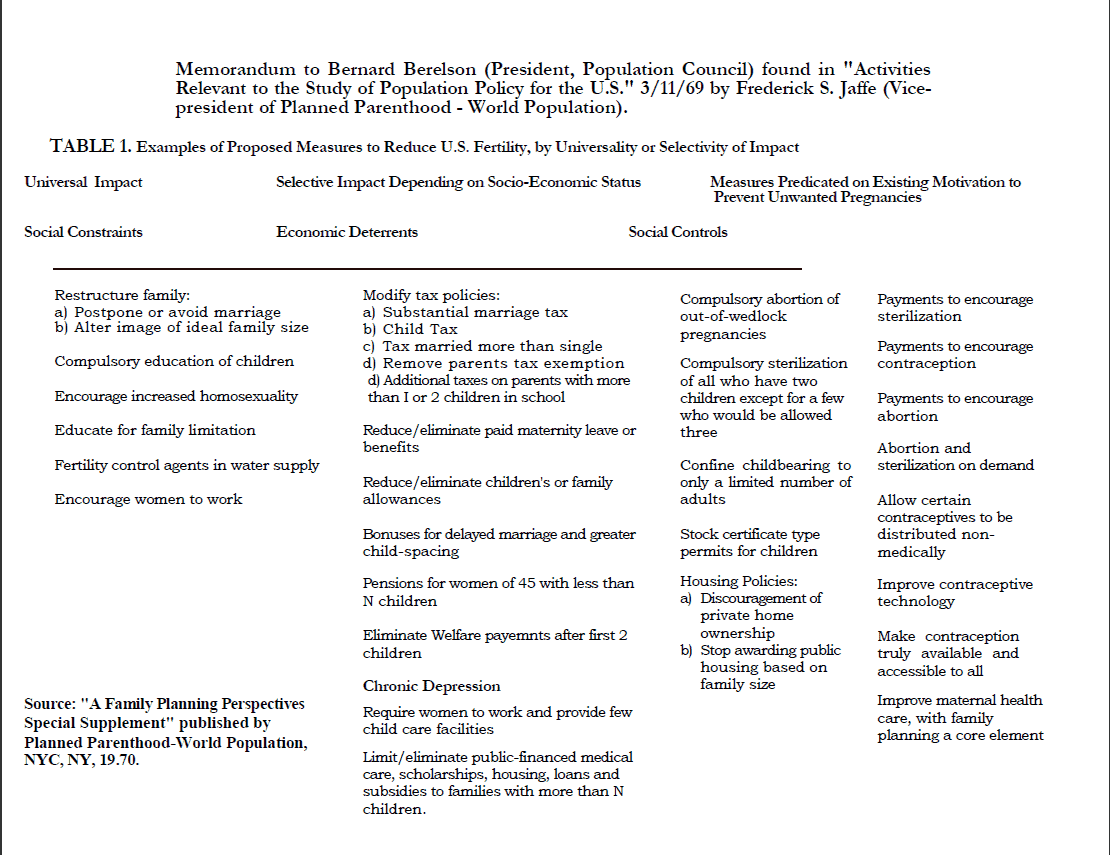 Ένα υπόμνημα του 1969 στον Bernard Berelson, πρόεδρο του Συμβουλίου Πληθυσμού , από τον Frederick S. Jaffe, τότε αντιπρόεδρο της Planned Parenthood, αποκαλύπτει τις σοκαριστικές προτάσεις του διεθνούς οργανισμού ευγονικής για την μείωση του πληθυσμού, ανάμεσα στις οποίες διαβάζουμε και την ”ενθάρρυνση της ομοφυλοφιλίας”, την ”αναδιάρθρωση της οικογένειας” καθώς και ”παράγοντες ελέγχου γονιμότητας” στο νερό.