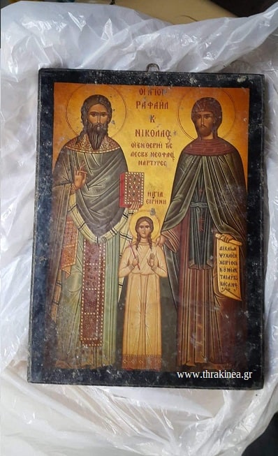 Ακουμπισμένη σε όρθια θέση επάνω σε έναν καμένο κορμό ενός δέντρου βρισκόταν μια ξύλινη εικόνα του Αγίου Ραφαήλ σε παράσταση μαζί με τον Άγιο Νικόλαο και την Αγία Ειρήνη! Όλη η γύρω περιοχή ήταν πλήρως καμένη και η εικόνα είχε επάνω της μόνο κάποιες στάχτες και λίγες λάσπες!