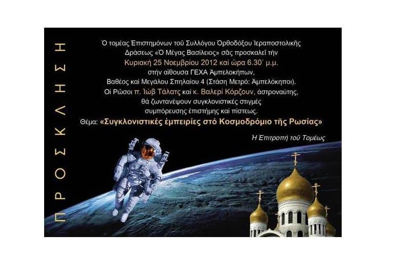 ΠΡΟΣΚΛΗΣΗ : Ο τομέας Επιστημόνων του Συλλόγου Ορθοδόξου Ιεραποστολικής Δράσεως "Ο Μέγας Βασίλειος" σας προσκαλεί στην εκδήλωση με θέμα: «Συγκλονιστικές εμπειρίες στο Κοσμοδρόμιο της Ρωσίας» που θα γίνει σε Αθήνα (25-11-12) και Θεσ/νίκη (24-11-12).