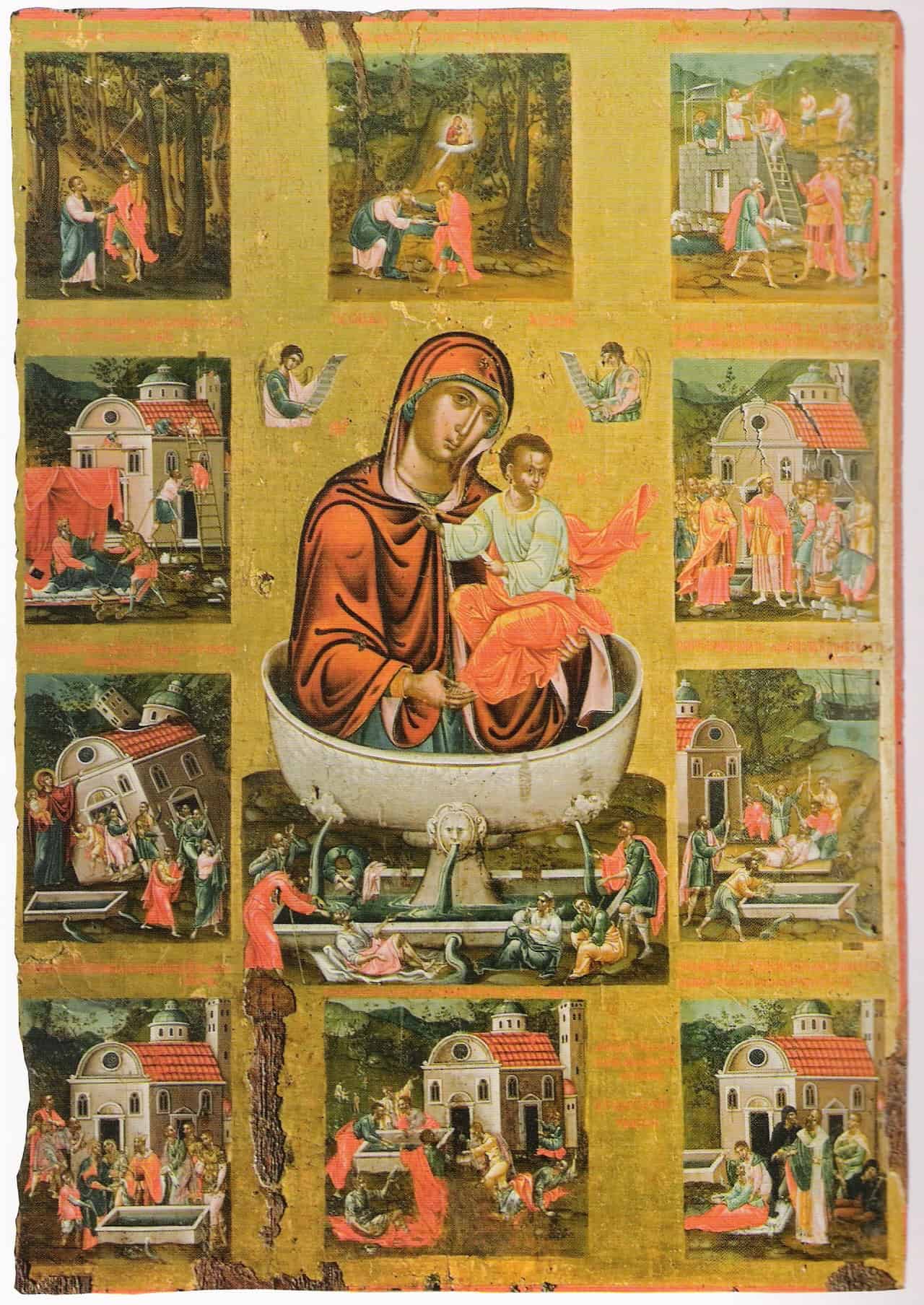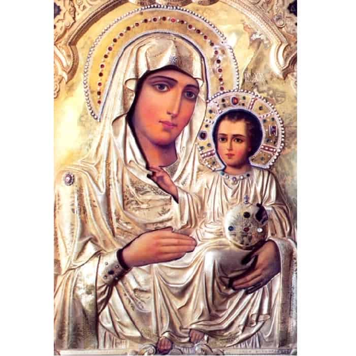 Παρθένε Δέσποινα Θεοτόκε, εσύ που κυοφόρησες τον Σωτήρα Χριστό και Θεό μας, σ’ εσένα αναθέτω όλη την ελπίδα μου, και σ’ εσένα, την υψηλότερη από όλες τις ουράνιες αγγελικές Δυνάμεις, έχω την εμπιστοσύνη μου.