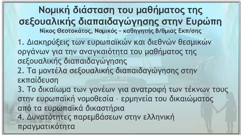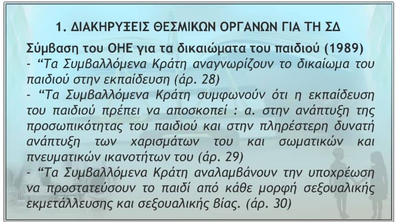 - Ὁ Βοηθός τοῦ Συνηγόρου τοῦ Πολίτη γιά τά δικαιώματα τοῦ παιδιοῦ ὑποστηρίζει σέ ἄρθρο του ὅτι τό δικαίωμα τοῦ παιδιοῦ στήν ἐκπαίδευση, ὅπως ὁρίζεται στή Σύμβαση τῶν δικαιωμάτων τοῦ Παιδιοῦ, περιλαμβάνει τήν “ἀγωγή ὑγείας καί σεξουαλική διαπαιδαγώγηση τῶν παιδιῶν, προσαρμοσμένη στίς ἡλικιακές τους ἀνάγκες”.