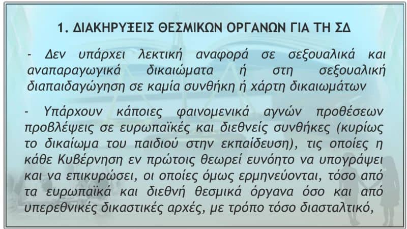 Δέν ὑπάρχει, ἑπομένως, λεκτική ἀναφορά σέ σεξουαλικά καί ἀναπαραγωγικά δικαιώματα ἤ στή σεξουαλική διαπαιδαγώγηση σέ καμία συνθήκη ἤ χάρτη δικαιωμάτων πού νά ἔχει ψηφιστεῖ ἀπευθείας ἀπό κράτη – μέλη τῆς ΕΕ ἤ τοῦ ΟΗΕ. Ὑπάρχουν κάποιες φαινομενικά ἁγνῶν προθέσεων προβλέψεις σέ εὐρωπαϊκές καί διεθνεῖς συνθῆκες (κυρίως τό δικαίωμα τοῦ παιδιοῦ στήν ἐκπαίδευση), τίς ὁποῖες ἡ κάθε Κυβέρνηση ἐν πρώτοις θεωρεῖ εὐνόητο νά ὑπογράψει καί νά ἐπικυρώσει, οἱ ὁποῖες ὅμως ἑρμηνεύονται, τόσο ἀπό τά εὐρωπαϊκά καί διεθνῆ θεσμικά ὄργανα ὅσο καί ἀπό ὑπερεθνικές δικαστικές ἀρχές, μέ τρόπο τόσο διασταλτικό, πού σχεδόν κρίνεται ὅτι ὑποχρεώνουν τά συμβαλλόμενα κράτη ὄχι μόνο νά εἰσαγάγουν τό μάθημα τῆς σεξουαλικῆς διαπαιδαγώγησης στό ἐκπαιδευτικό τους πρόγραμμα, ἀλλά καί νά τοῦ προσδώσουν συγκεκριμένο περιεχόμενο, αὐτό δηλ. τῆς ὁλιστικῆς σεξουαλικῆς διαπαιδαγώγησης.