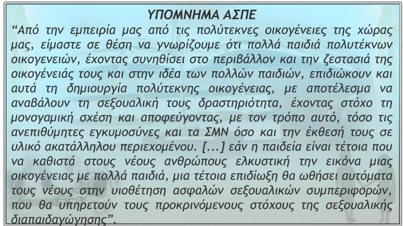Ἐπίσης, ἡ Ἀνωτάτη Συνομοσπονδία Πολυτέκνων Ἑλλάδος, σέ Ὑπόμνημά της στήν Ἐπιτροπή Μορφωτικῶν Ὑποθέσεων τῆς Βουλῆς, σχετικά μέ τήν ψήφιση τοῦ πρόσφατου νομοσχεδίου γιά τήν ἐκπαίδευση, στό παράρτημα μέ τίς ἀπόψεις της γιά τήν εἰσαγωγή τοῦ μαθήματος τῆς σεξουαλικῆς διαπαιδαγώγησης ἐπισημαίνει, μεταξύ ἄλλων, ὅτι: “Ἀπό τήν ἐμπειρία μας ἀπό τίς πολύτεκνες οἰκογένειες τῆς χώρας μας, εἴμαστε σέ θέση νά γνωρίζουμε ὅτι πολλά παιδιά πολυτέκνων οἰκογενειῶν, ἔχοντας συνηθίσει στό περιβάλλον καί τήν ζεστασιά τῆς οἰκογένειάς τους καί στήν ἰδέα τῶν πολλῶν παιδιῶν, ἐπιδιώκουν καί αὐτά τή δημιουργία πολύτεκνης οἰκογένειας, μέ ἀποτέλεσμα νά ἀναβάλουν τή σεξουαλική τους δραστηριότητα, ἔχοντας στόχο τή μονογαμική σχέση καί ἀποφεύγοντας, μέ τόν τρόπο αὐτό, τόσο τίς ἀνεπιθύμητες ἐγκυμοσύνες καί τά ΣΜΝ ὅσο καί τήν ἔκθεσή τους σέ ὑλικό ἀκατάλληλου περιεχομένου. [...] ἐάν ἡ παιδεία εἶναι τέτοια πού νά καθιστᾶ στούς νέους ἀνθρώπους ἑλκυστική τήν εἰκόνα μίας οἰκογένειας μέ πολλά παιδιά, μία τέτοια ἐπιδίωξη θά ὠθήσει αὐτόματα τούς νέους στήν υἱοθέτηση ἀσφαλῶν σεξουαλικῶν συμπεριφορῶν, πού θά ὑπηρετοῦν τούς προκρινόμενους στόχους τῆς σεξουαλικῆς διαπαιδαγώγησης”. Σέ μία χώρα πού βιώνει, ὅσο καμία ἄλλη, τίς ὀδυνηρές συνέπειες τοῦ δημογραφικοῦ προβλήματος, μέ τήν ἐρήμωση τῆς ἐπαρχίας, τό κλείσιμο ἐπιχειρήσεων καί τή διάλυση τοῦ ἀσφαλιστικοῦ συστήματος, πόσοι ἄραγε ἀπό τήν Πολιτεία ἔχουν σκεφτεῖ νά δοῦν τή σεξουαλική διαπαιδαγώγηση ὄχι ὡς μάθημα πού θά διδάσκει τή σεξουαλική ἱκανοποίηση χωρίς τήν ἀνάληψη καμίας εὐθύνης, ἀλλά ὡς παιδεία μέ κατεύθυνση τή δημιουργία πολυτέκνων οἰκογενειῶν, συμβάλλοντας ἔτσι στήν ἀνατροπή τοῦ δημογραφικοῦ κατήφορου;