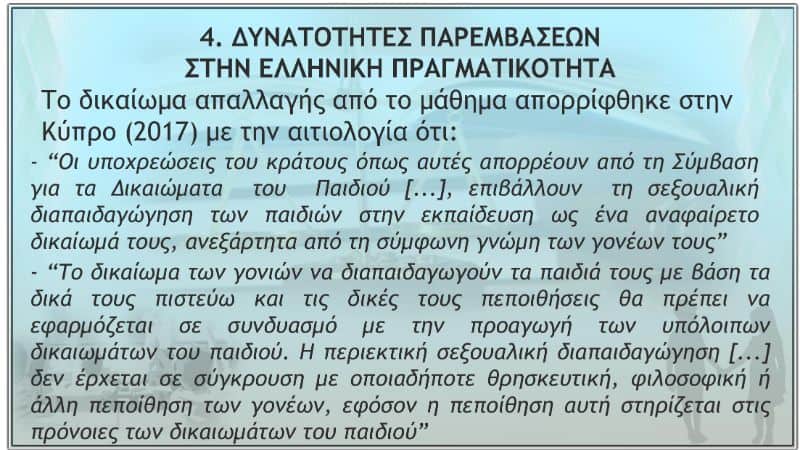 - Ἡ Ἐπίτροπος γιά τά Δικαιώματα τοῦ Παιδιοῦ στήν Κύπρο θεωρεῖ ὅτι ἡ περιεκτική σεξουαλική διαπαιδαγώγηση “κατοχυρώνεται ἀπό τή Σύμβαση τῶν Ἡνωμένων Ἐθνῶν γιά τά δικαιώματα τοῦ παιδιοῦ”.
