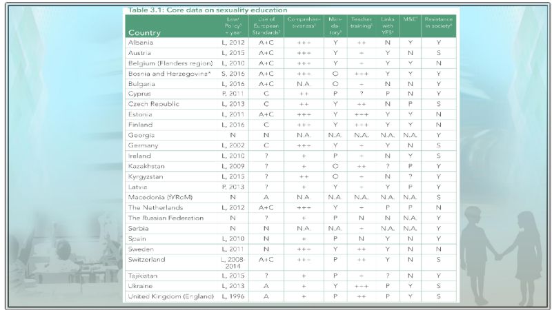 - Τό Εὐρωπαϊκό Κοινοβούλιο, σέ ψήφισμά του ἐπ’ εὐκαιρία τῆς συμπλήρωσης 30 ἐτῶν ἀπό τή σύμβαση τοῦ ΟΗΕ γιά τά δικαιώματα τοῦ παιδιοῦ: “31. καλεῖ τά κράτη μέλη νά ἐγγυηθοῦν τό δικαίωμα στήν χωρίς ἀποκλεισμούς ἐκπαίδευση καί νά διασφαλίσουν τήν πρόσβαση σέ πλήρεις καί κατάλληλες γιά κάθε διαφορετική ἡλικία πληροφορίες γιά τό σέξ καί τή σεξουαλικότητα, τήν πρόσβαση στήν ἰατρική περίθαλψη γιά θέματα σεξουαλικῆς καί ἀναπαραγωγικῆς ὑγείας, καί τήν διαπαιδαγώγηση τῶν νέων στά σχολεῖα πάνω σέ θέματα σχέσεων, δεδομένων ἰδίως τῶν μέτρων πού λαμβάνουν ὁρισμένες χῶρες οἱ ὁποῖες ἀπαγορεύουν στά σχολεῖα νά ἀσχολοῦνται μέ τόν γενετήσιο προσανατολισμό καί τήν ταυτότητα φύλου”.