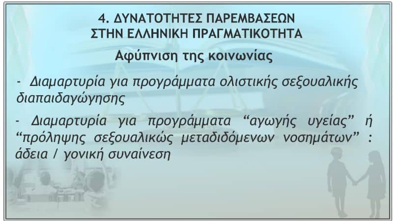 Μέ βάση λοιπόν ὅλα τά παραπάνω, ποιές δυνατότητες παρεμβάσεων ὑπάρχουν στήν ἑλληνική πραγματικότητα, σέ σχέση μέ τήν ἐπιχειρούμενη εἰσαγωγή τοῦ μαθήματος τῆς σεξουαλικῆς διαπαιδαγώγησης, γιά τήν προστασία τῶν οἰκογενειῶν πού θεωροῦν ὅτι θίγονται ἀπό τό περιεχόμενό του;