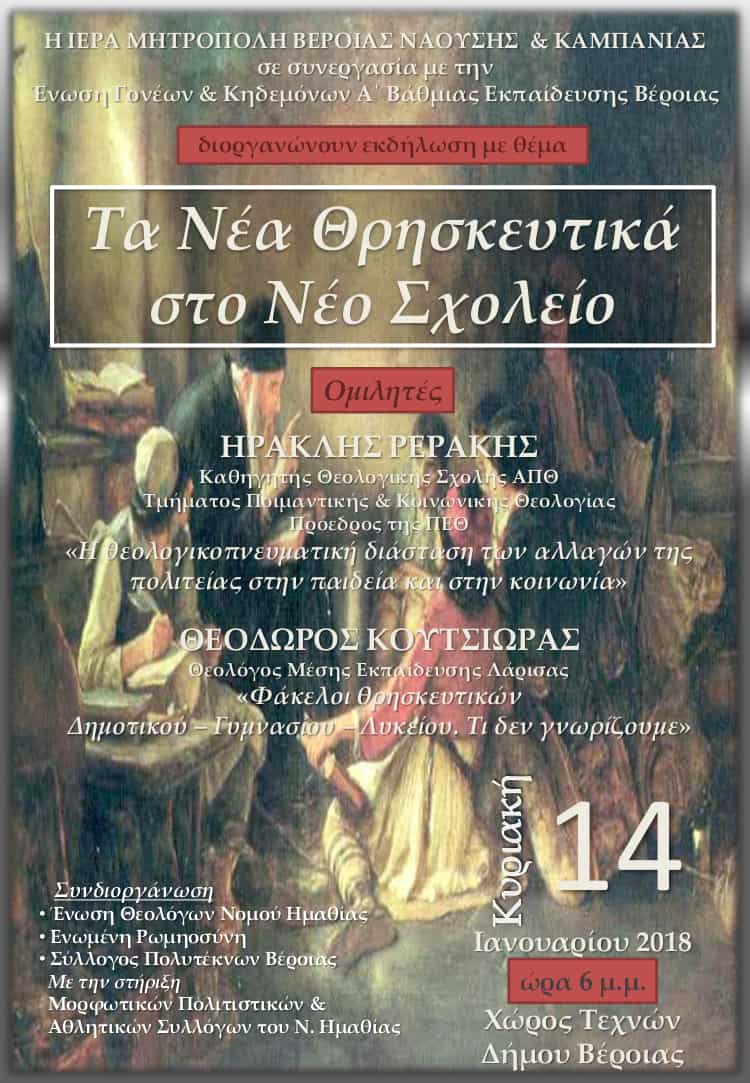 Eκδήλωση με θέμα: «Τά Θρησκευτικά στό νέο σχολεῖο» θα πραγματοποιηθεί στο Χώρο Τεχνών Δήμου Βέροιας, την Κυριακή 14 Ιανουαρίου 2018 και ώρα 6 μ.μ. Θα μιλήσουν οι: Ηρακλής Ρεράκης Καθηγητής Θεολογικής Σχολής ΑΠΘ, Θεόδωρος Κουτσιώρας Θεολόγος