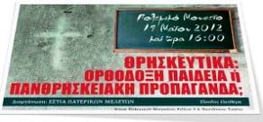 Σήμερα, Σάββατο 29 Δεκεμβρίου 2012, στήν αἴθουσα τῆς Ἑνώσεως Γονέων «Ἡ Χριστιανική Ἀγωγή» τμήματος Ἀμπελοκήπων, πραγματοποιήθηκε Σύναξη Θεολόγων και Ἐκπαιδευτικῶν μέ θέμα: «Τό μάθημα τῶν Θρησκευτικῶν στόν καιρό τῆς πανθρησκείας». Ἡ Σύναξη τελοῦσε ὑπό την αἰγίδα τῆς Ἀδελφότητος Θεολόγων «Ὁ Σωτήρ» και τοῦ τομέως Ἐπιστημόνων τοῦ Συλλόγου Ὀρθοδόξου Ἱεραποστολικῆς Δράσεως «Ὁ Μέγας Βασίλειος».