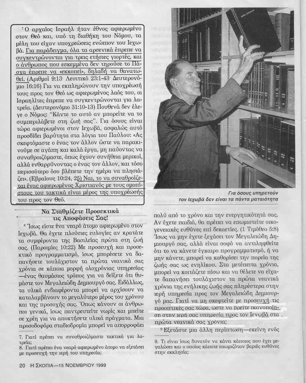«Σκοπιά» 15 Νοεμβρίου 1999, σελίδα 20: Υποχρεωτική η συμμετοχή των ΜτΙ στις συναθροίσεις