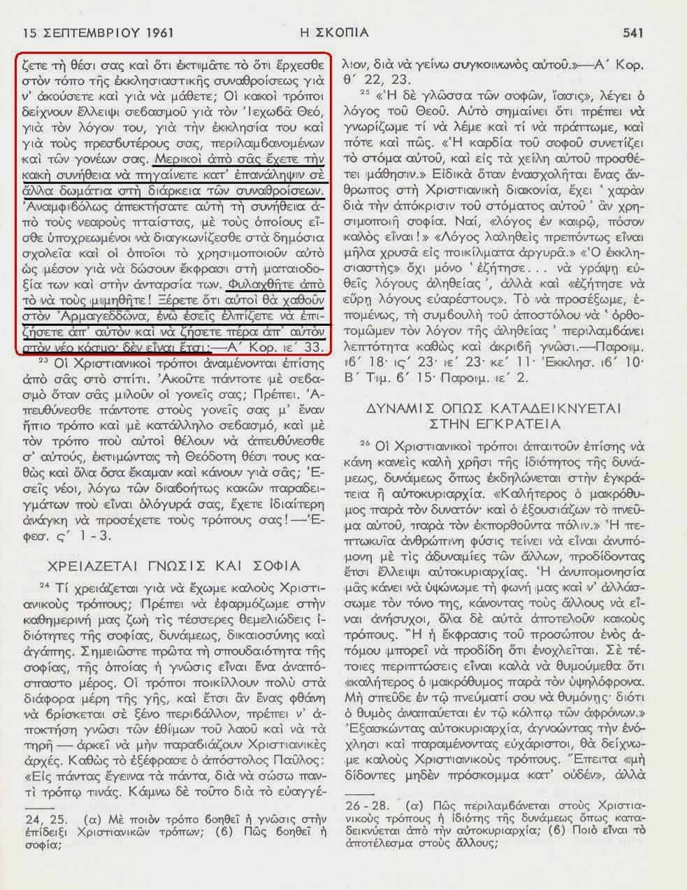 Είναι δε τόσο ανιαρές οι συναθροίσεις, που οι νέοι σηκώνονται και φεύγουν από αυτές και γυρίζουν στα άλλα δωμάτια της «Αίθουσας Βασιλείας» για να περάσουν την ώρα τους. Στο ντοκουμέντο που δημοσιεύουμε και είναι από τη «Σκοπιά» της 15ης Σεπτεμβρίου 1961, σελίδα 541, φαίνεται για μία ακόμη φορά η … «ελευθερία» που λέγαμε και πιο πάνω, πως επιδεικνύει η Οργάνωση. Διότι, απειλεί τους νέους, πως αν δεν συμμορφωθούν και δεν σταματήσουν να φεύγουν από την συνάθροιση περιφερόμενοι από εδώ και από εκεί θα χαθούν στον Αρμαγεδδώνα!