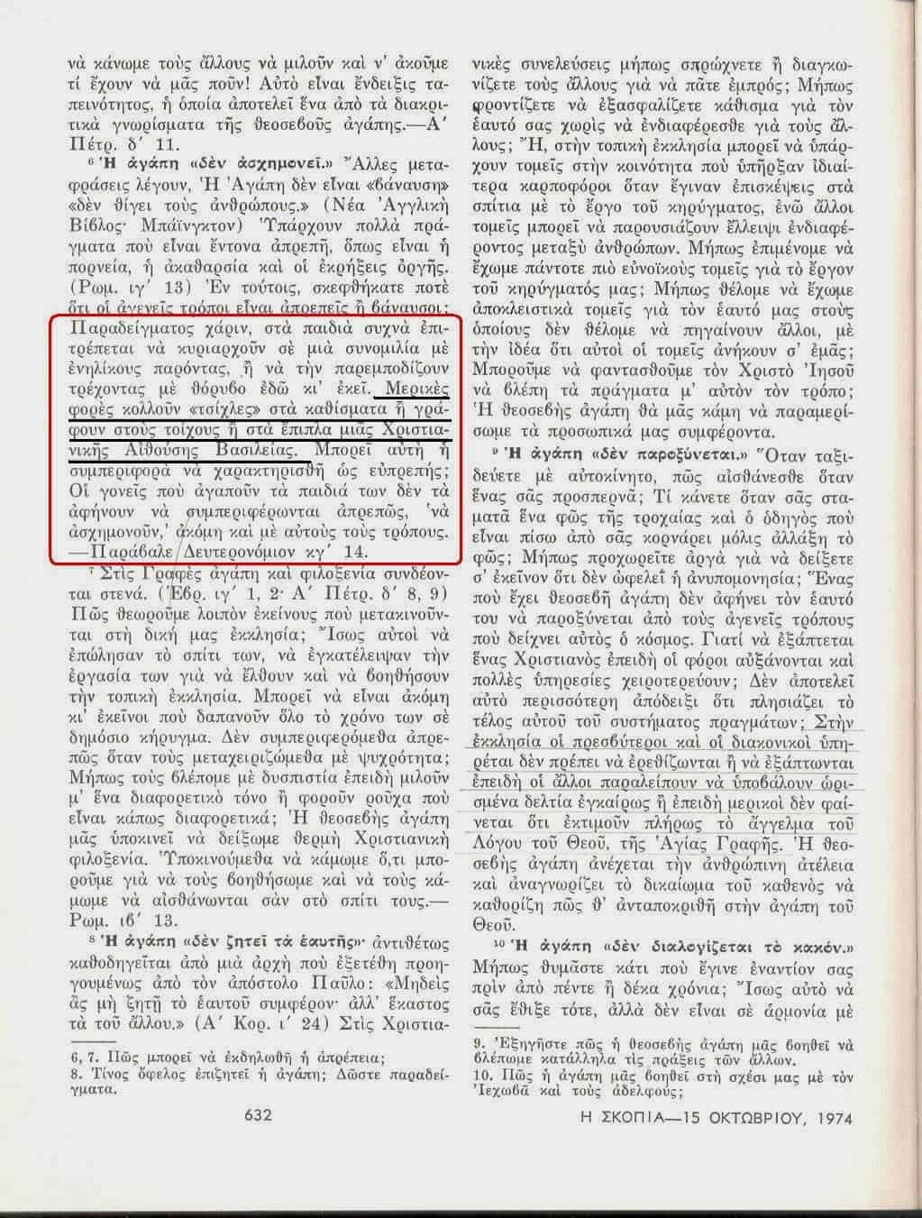 «Σκοπιά» 15 Οκτωβρίου 1974, σελίδα 632: Μικρά παιδιά των ΜτΙ, κολλούν τσίχλες στα καθίσματα, γράφουν στους τοίχους ή στα διάφορα έπιπλα της «Αίθουσας Βασιλείας»