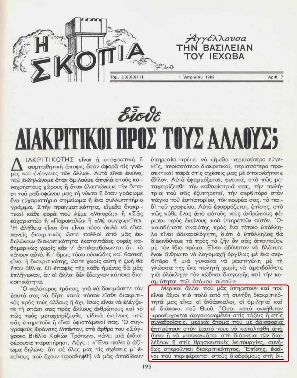 Και αφήσαμε για το τέλος, την «Σκοπιά» της 1ης Απριλίου 1962, σελίδα 195, που συνοψίζει την εν γένει συμπεριφορά των Μαρτύρων του Ιεχωβά, όταν συμμετέχουν στις συναθροίσεις της Οργάνωσής τους, τελώντας ταυτόχρονα και τα θρησκευτικά τους καθήκοντα. Άλλοι λοιπόν από τους Μάρτυρες του Ιεχωβά πάνε πάντα αργοπορημένοι σ’ αυτές, άλλοι περιφέρονται στους διαδρόμους και άλλοι μισοκοιμούνται ή κοιμούνται τελείως! (καλά δεν έχουν σπίτι να κοιμηθούν, τις «Αίθουσες Βασιλείας» βρήκαν;):