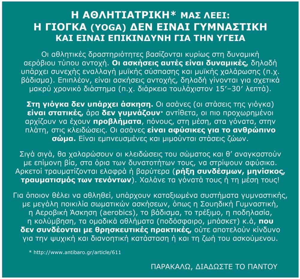 γ) Πινακίδα πράσινη, με κείμενο σχετικό με τις βλάβες που προξενεί η γιόγκα στη σωματική υγεία (συνιστάται για ιστοτόπους γενικού προσανατολισμού).