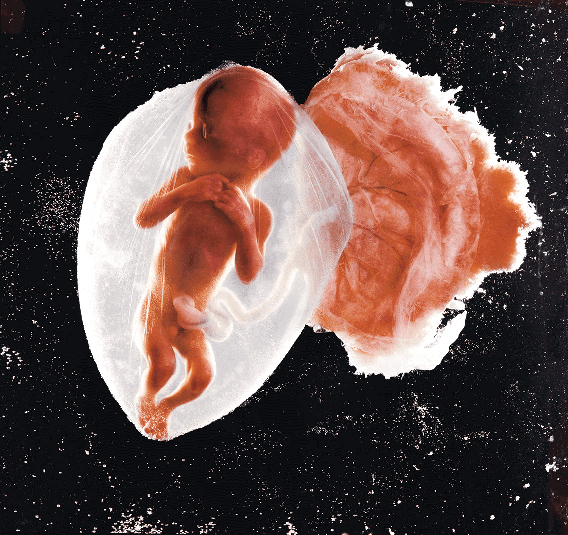 Σε μια φωτογραφία ενός αγέννητου μωρού 13 εβδομάδων, φαίνεται ο αμνιακός σάκος και ο πλακούντας να περιβάλλουν ένα μικροσκοπικό μωρό, με ήδη διακριτά δάκτυλα στα χέρια και τα ποδαράκια του, με μάτια, με αυτιά και πλευρές.