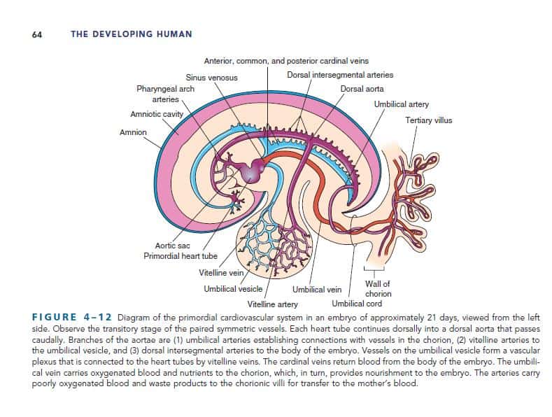 Παρακάτω παραθέτουμε σχετική Εικόνα από το επιστημονικό σύγγραμμα: Moore Keith L. – Persaud T.V.N., «Η ανθρώπινη διάπλαση. Εμβρυολογία Κλινικού προσανατολισμού» (8η έκδοση, 1η ελληνική, εκδ. Πασχαλίδη, Αθήνα 2009, κεφ. 4, σελ. 77), όπου περιγράφεται το «αρχέγονο καρδιαγγειακό σύστημα εμβρύου 21 περίπου ημερών», δηλ. μόλις 3 ημέρες από την 18η ημέρα.