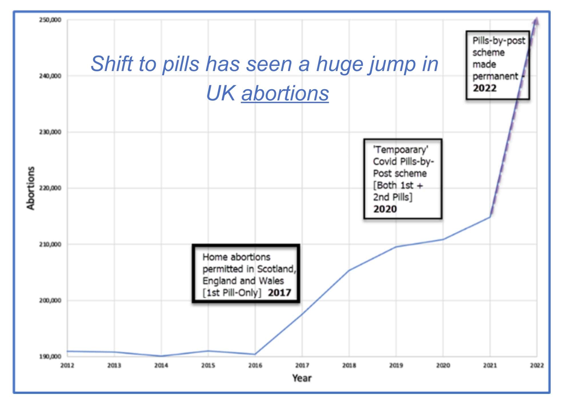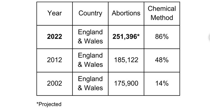 Κατά τη περίοδο των τελευταίων 20 ετών, σημειώθηκε πενταπλασιασμός των χημικών αμβλώσεων στην Αγγλία και την Ουαλία, οι οποίες τώρα αντιπροσωπεύουν το 86% όλων των αμβλώσεων (οι υπόλοιπες είναι χειρουργικές αμβλώσεις). Ειδικότερα διαπιστώθηκε αύξηση 83,7% στην έκτρωση με χημικά χάπια και αύξηση 30,03% στις αμβλώσεις συνολικά.