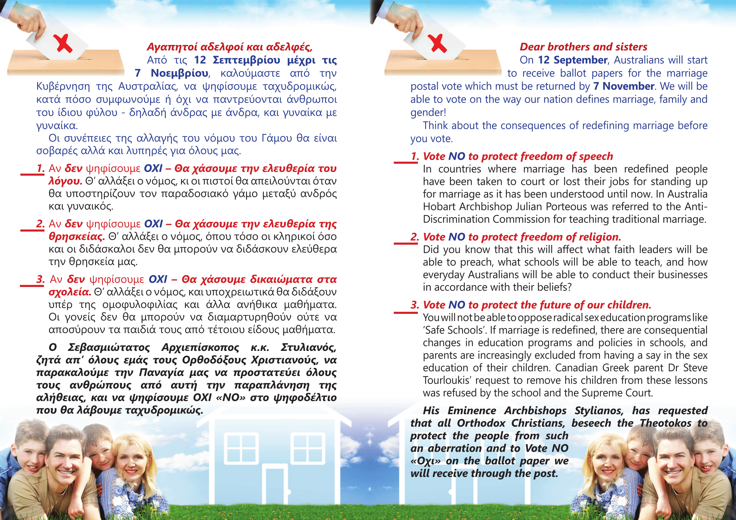 His Eminence Archbishops Stylianos, has requested that all Orthodox Christians, beseech the Theotokos to protect the people from such an aberration and to Vote NO «Οχι» on the ballot paper we will receive through the post..